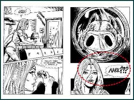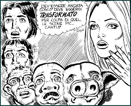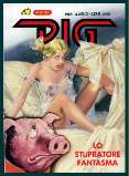 PIG The 64-part Fumetti series was published between 1983 and 1988 by the Italian publisher Ediperiodici (the label with the Condor logo) of the publisher Giorgio Cavedon. The predecessor Edizioni ErreGI was founded by Renzo Barbieri (October 3, 1930 - September 23, 2007) and Giorgio Cavedon (December 1, 1930 - October 14, 2001) in the early 1970s and was based in Milan. Two years later, Cavedon and Barbieri parted company. Barbieri founded his own publishing house Edifumetto (the label with the shark logo * ) and Cavedon kept the ErreGI series and character, but now published them under the Ediperiodici label. "PIG" was conceived and written by Carmelo Gozzo and Piercarlo Macchi (with the collaboration of the Inker Luciano Milano) was responsible for the extensive drawings. From issue 55 onwards, the page count increased from the initial 108 pages to impressive 184 pages. Carmelo Gozzo (born April 4, 1943) has worked for Ediperiodici - in addition to "PIG" - on the series "Terror", "Storie Blu", "Storie Viola", .... In the 1990s, he worked for Sergio Bonelli Editore on the series "Zona X", for ACME on the series "Splatter" and for l'Editrice Universo on the magazine "Intrepido". He even wrote for Disney for a while and a story appeared in the German editions of the legendary "Lustige Taschenbücher" series (Halloween special volume). In the 1970s, Piercarlo Macchi created characters such as "Bert" and "Dippold l'Ottico", which were published in "Il Fumetto". In 1978, he joined the "Alan Ford" team of artists alongside Romanini and Chiarini as Paolo Piffarerio's successor. From 1988, the team of Carmelo Gozzo, Pier Carlo Macchi and Luciano Milano worked on the science fiction erotic series Ward L'Invisibile. In it, Gozzo revisits the "superheroes and invisible man" theme again - this time embodied by an inconspicuous bellboy. The series was discontinued after seven issues (in 1989). "PIG" also owes its success to the unmistakable, almost iconic cover motifs, which were created by Enzo Sciotti (September 24, 1944 to April 11, 2021), Averardo Ciriello (May 28, 1918 to November 5th,2016), Mario Carìa (May 3rd,1934 to September 15, 2001) and Alfredo Nocerino. (1) The quality of the story and the drawings can be rated as very good throughout the entire series. Carmelo Gozzo was always able to feed his twisty story with new and even crazier ideas to keep readers entertained. "The "PIG" series is an extremely funny, unrestrained and imaginative comic book series with an almost inexhaustible supply of crazy ideas and twists. The main theme of anthropomorphic "transformation" through sexual acts provides the necessary scenes, which are written copiously into the stories and shown without shame or censorship. The language is sometimes coarse and in places sexist by today's standards, the sex acts shown are questionable in parts (rape,...); but ultimately a typical Fumetti product of its time. The combination of animal lust and sex was perfectly visualised with the "pig gimmick"." (2) Of course, "PIG" also deals with the taboo subject of "sex with animals" - but without really addressing or showing it! The "anti-hero" Mark Raymond is the victim of a reckless experiment by a negligent (criminal) wannabe scientist, Allen Atkins. In his transformed form, Mark is therefore not an animal, but a human being "trapped" or rather punished with a grotesque pig's head. And his transformation/redemption is the orgasm. Only in issue #14 is one picture ** that could possibly be linked to the taboo of "beastiality". But Carmelo Gozzo solves this "encounter" in a rather humorous way. The main protagonist Mark is - as so often in the series - on the run and hides in an animal transporter - loaded with pigs. During the rather boring journey, Mark distracts himself with an erotic dream and after his climax, a nearby pig "licks his best part clean". The subsequent headbutt from an outraged Mark resolves the whole scene in a satirical and grotesque manner, without being suggestive or even arousing. However, the Italian text "Ci mancava anche il porco pederasta!" probably refers to a homosexual implication.